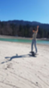 In Bewegung ähnelt es einem Skateboard, fährt sich aber eher wie ein Snow- oder Surfbrett. Sie beginnen, indem Sie Ihren Fuß auf die Seite stellen, die auf dem Boden ruhen sollte. Setzen Sie dann den anderen Fuß auf die erhöhte Seite des Brettes und ab geht die Post!